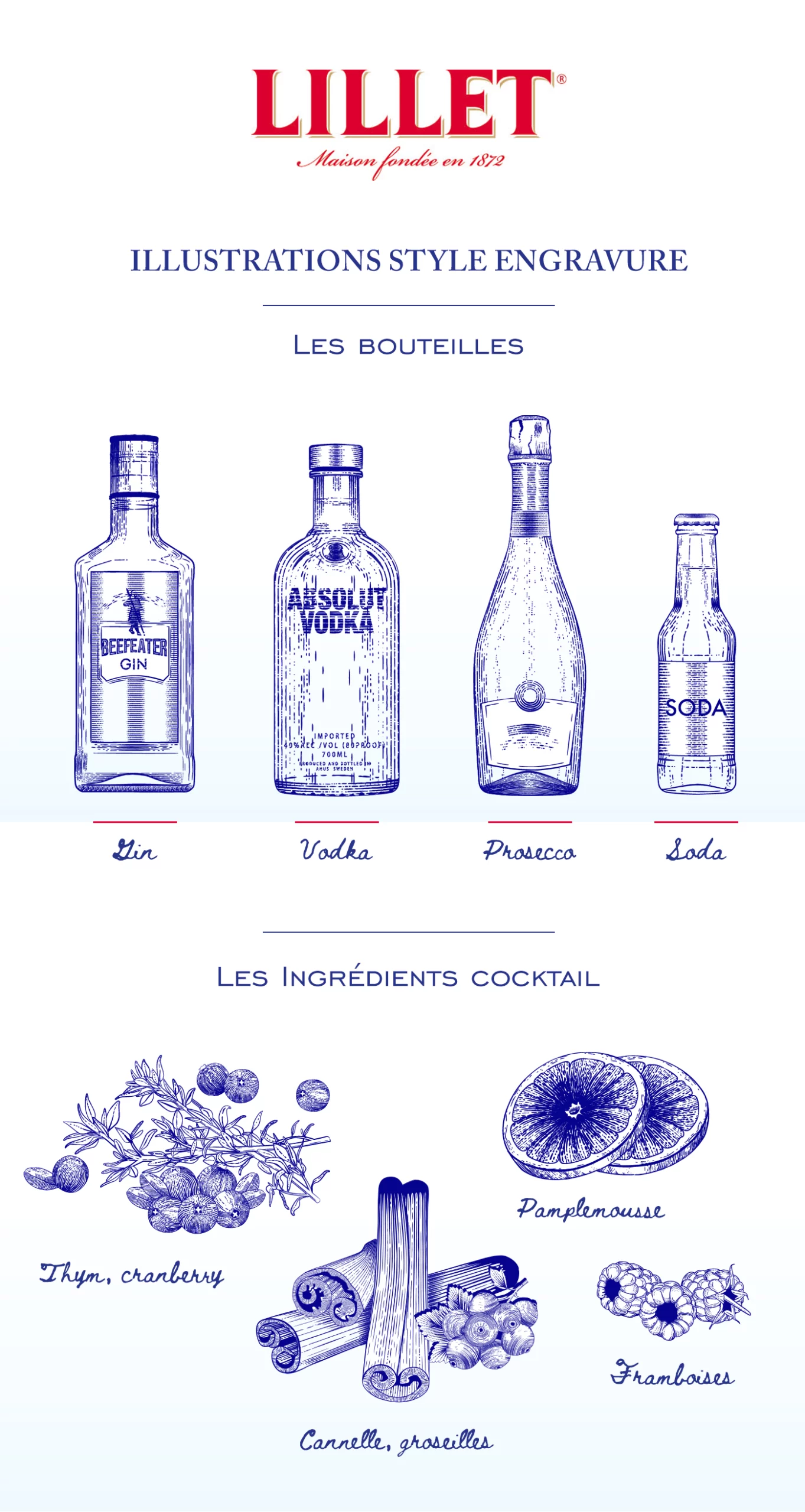 Created detailed vector illustrations in an engraving style for Lillet’s beverage products and ingredients. Delivered source files optimized for various uses across branding and marketing materials.